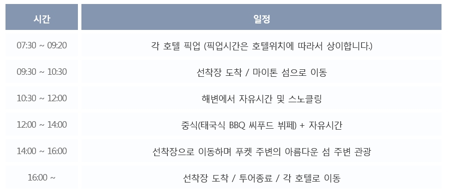 왕복픽업차량, 영어가이드, 음료수, 계절과일, 태국식뷔페(간단한 씨푸드BBQ),