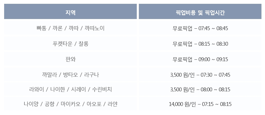 *빠통, 까따, 까론, 까타노이, 판와, 푸켓타운, 찰롱을 제외한 지역은 추가비용이 발생합니다.