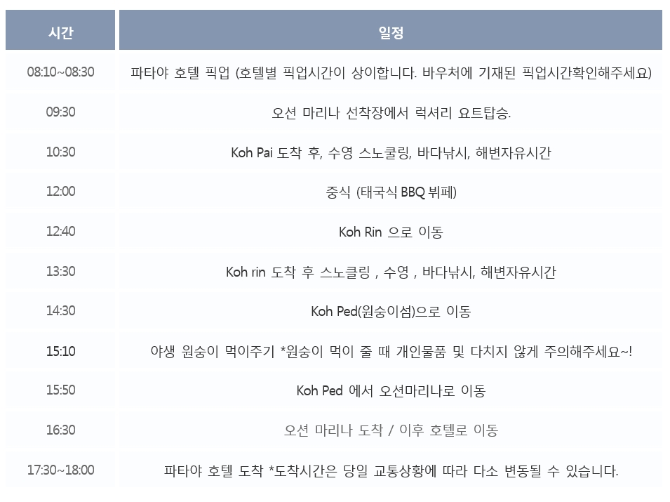 별도로 출발하시는 분들은 파타야 오션 마리나에서 오전 9시까지 도착바랍니다.