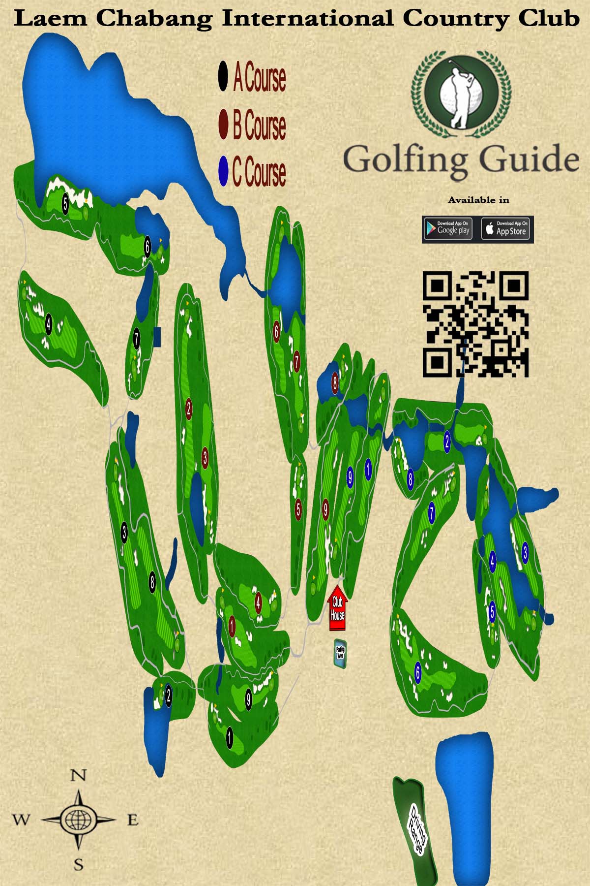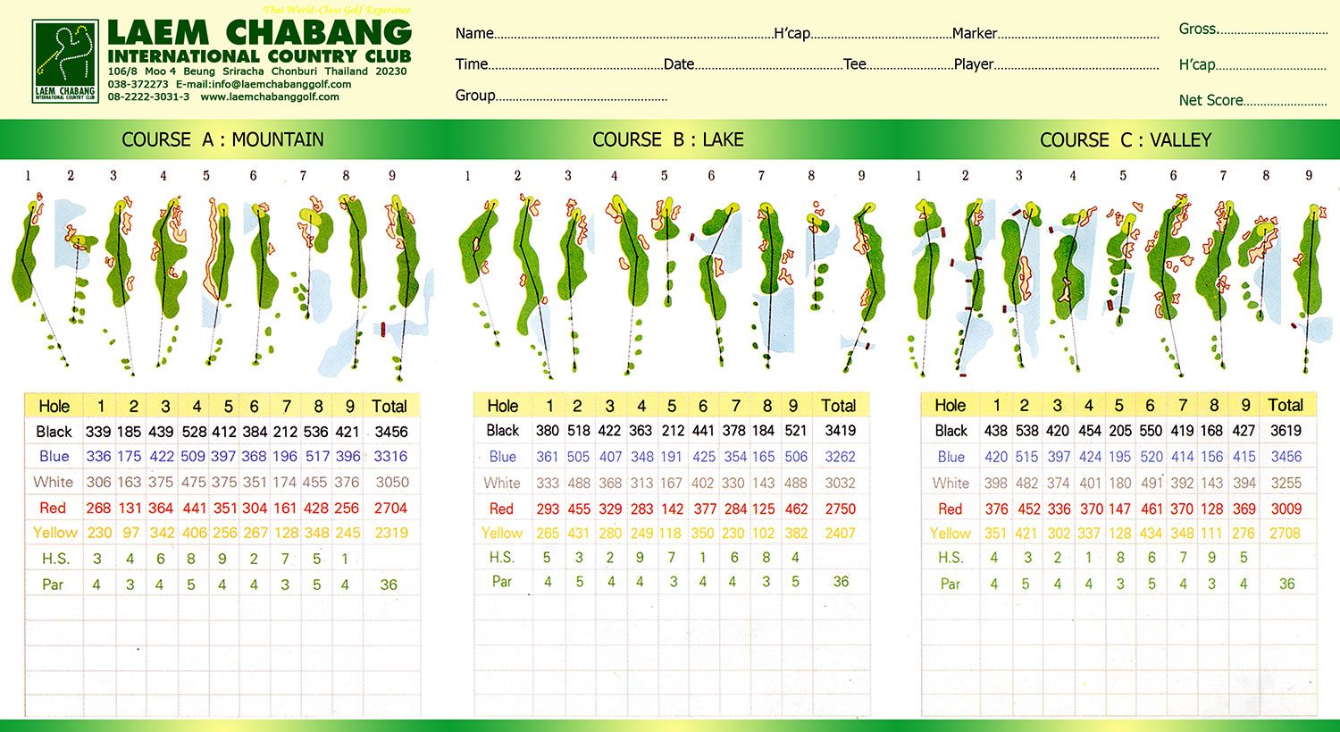 A: Mountain, B: Lake, C: Valley 코스로 9홀씩 나누어져 있으며,