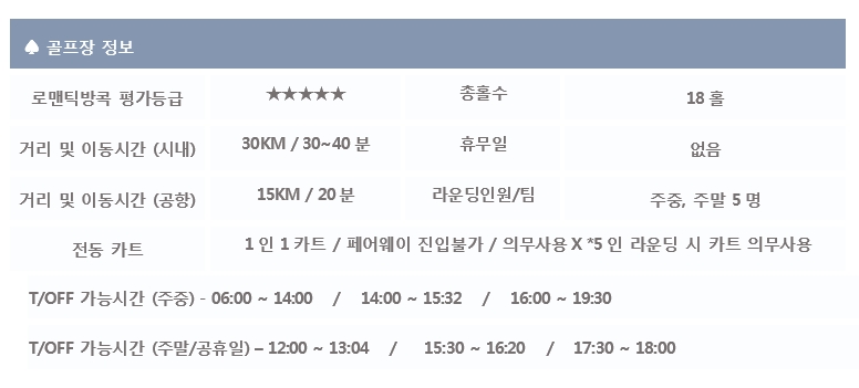 방콕 시내에서 약 20~30km 떨어진 곳에 위치하여 가장 가까운 수준급 골프장으로도 유명합니다.